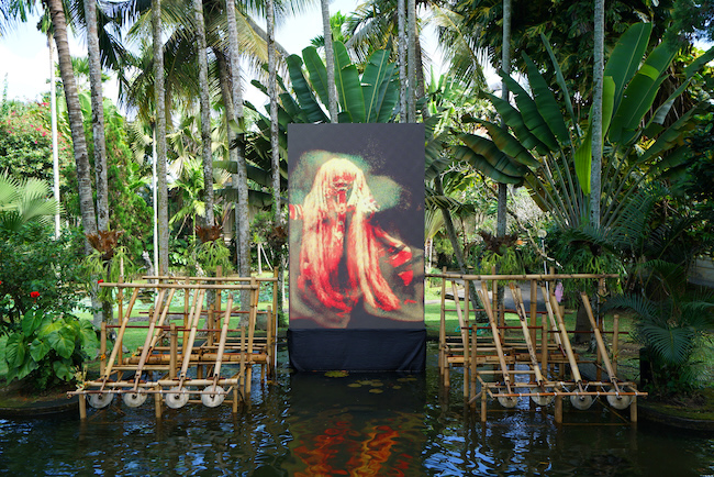 Set within a bamboo framework, Amrta incorporates traditional Balinese musical instruments - reong and rindik - within a mechanised system that channels water through hollow bamboo tubes. Bamboo arms, activated by environmental data from the Pakerisan River, rise and fall to strike the instruments, creating a soundscape that, while chaotic, resonates with the tonal complexity of gamelan music. At the centre of the installation, a spectral figure of Rangda, the queen of Leyaks from the Calonarang dance drama, moves across a screen. Her ghostly dance, shaped by fluctuations in environmental data, reflects the fragility of Bali’s natural systems: the pH of the river influences her movements, carbon dioxide levels affect particle stimulation, and temperature shifts alter the colours in the visuals.